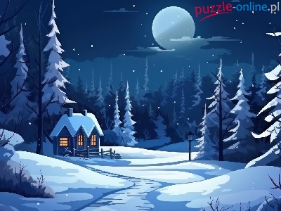 Księżyc, Dom, Zima, Drzewa, Grafika, Noc