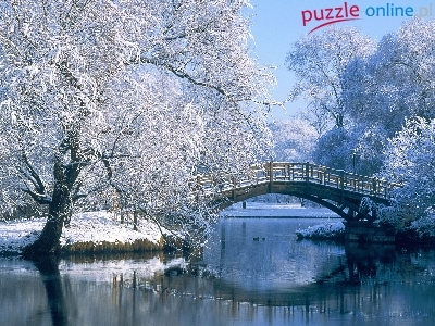 Drzewa, Mostek, Park, Ośnieżone, Rzeczka