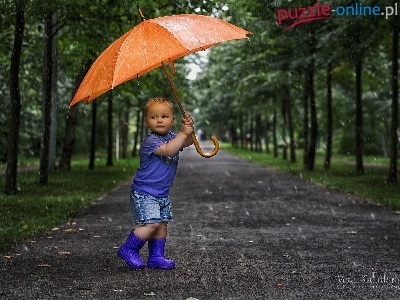Drzewa, Deszcz, Dziecko, Parasol, Droga