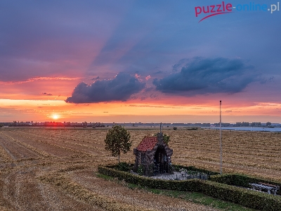 Chmury, Kapliczka, Pole, Drzewa, Niebo, Zachód słońca
