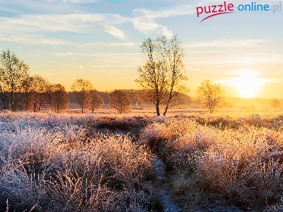 Trawy, Las, Pole, Drzewa, Wschód słońca, Oszronione