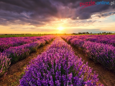 Lato, Lawenda, Pole, Drzewa, Zachód słońca, Chmury