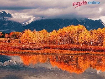 Puzzle Drzewa, Góry, Pomarańczowe, Rzeka