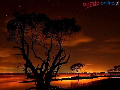 Drzewa, Słońca, Jezioro, Rozlewisko, Zachód