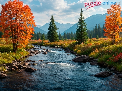 Jesień, Drzewa, Rzeczka, Chmury, Góry