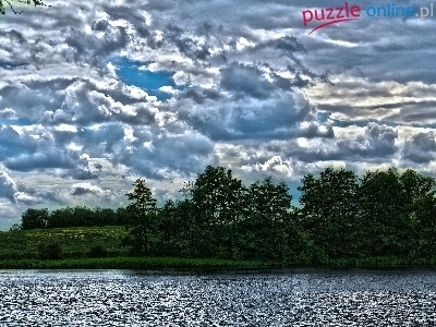 Drzewa, Niebo, Duża, Rzeka, Zachmurzone