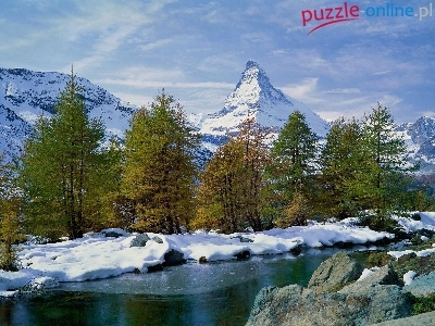 Drzewa, Kamienie, Góry, Rzeka, Śnieg