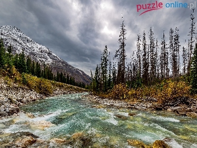 Drzewa, Niebo, Góry, Rzeka, Kamienie