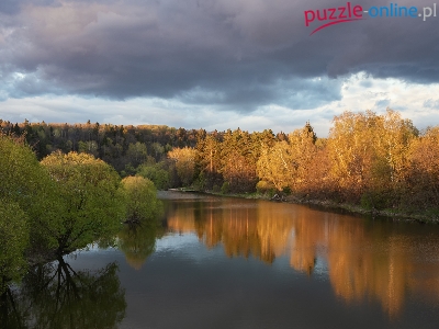 Chmury, Las, Jesień, Drzewa, Odbicie, Rzeka
