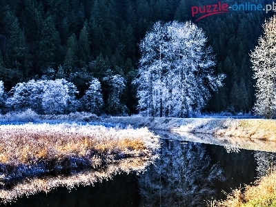 Drzewa, Śnieg, Noc, Zima, Rzeka, Szron