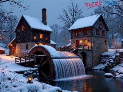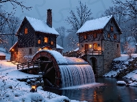 Drzewa, Zima, Śnieg, AI, Oświetlone, Noc, Młyn, Domy, Rzeka, Wodny