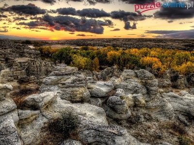 Puzzle Drzewa, Zachód Słońca, Skały, Chmury