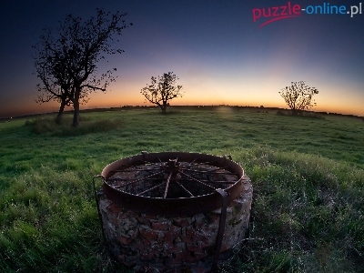 Drzewa, Koło, Łąka, Zachód Słońca, Studnia