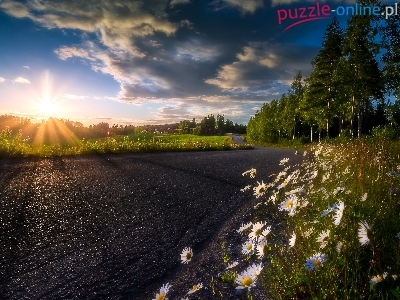 Drzewa, Margerytki, Droga, Wschód słońca, Kwiaty