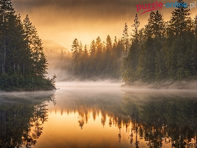 Jezioro, Las, Mgła, Drzewa, Wschód słońca