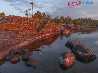 Kamienie, Wschód słońca, Skały, Rosja, Ładoga, Jezioro, Drzewa