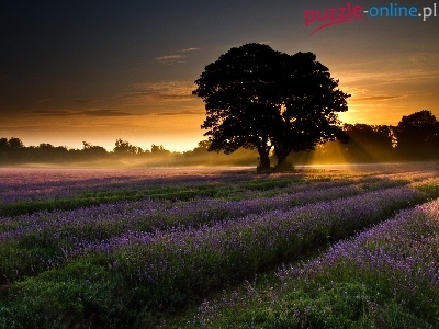 Puzzle Drzewa, Zachód, Słońca, Kwiaty