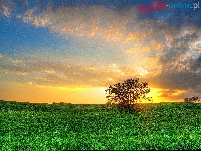 Puzzle Drzewa, Pole, Zachód słońca, Chmury