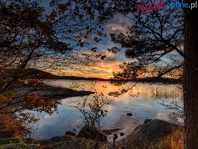 Puzzle Drzewa, Rzeka, Zachód słońca, Gałęzie