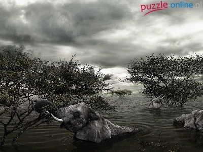 Puzzle Drzewa, Powódź, Słonie, Chmury