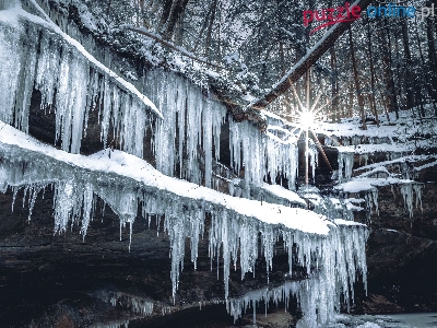 Promienie słońca, Sople, Zima, Las, Skała, Lód, Drzewa