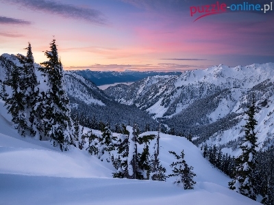Stan Waszyngton, Wschód Słońca, Drzewa, Teren spacerowy Artist Point, Stany Zjednoczone, Góry Kaskadowe, Zima