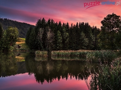 Puzzle Drzewa, Zachód Słońca, Staw, Dom