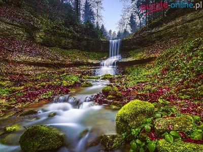 Wodospad Lippenrüti, Kamienie, Liście, Omszałe, Szwajcaria, Rzeka, Drzewa