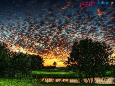 Drzewa, Chmury, Jezioro, Trawa, Ciemne