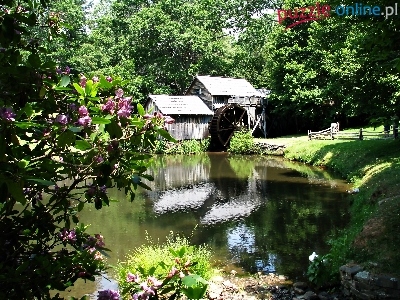 Wodny, Drzewa, Rododendrony, Łąka, Młyn, Staw, Kwitnące