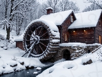 Koło, Zima, Wodny, Drzewa, Młyn, Śnieg, Rzeka