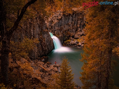 Drzewa, Kobieta, Skały, Wodospad, Jesień