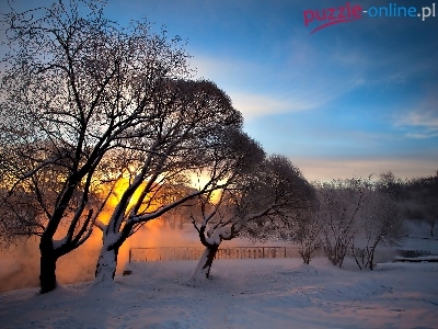 Puzzle Drzewa, Zima, Śnieg, Wschód słońca