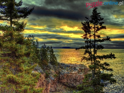 Drzewa, Jezioro, HDR, Chmury, Wybrzeże, Norwegia