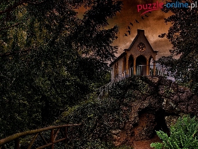 Drzewa, Ptaki. Poręcz, Las, Wzgórek, Domek