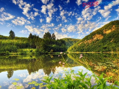 Puzzle Drzewa, Jezioro, Wzgórza, Chmury