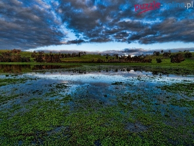 Drzewa, Wodorosty, Jezioro, Wzgórze, Chmury