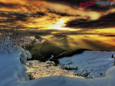 Góry Jura, Zachód słońca, Chmury, Zima, Szwajcaria, Lasy, Drzewa