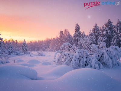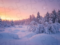 Zaspy, Las, Zima, Drzewa, Wschód słońca, Ośnieżone