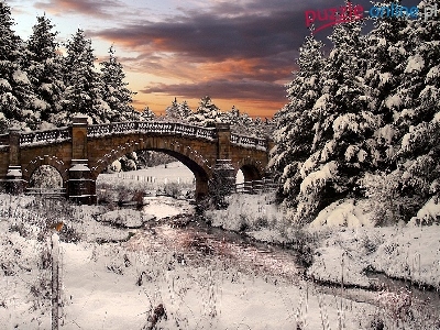 Puzzle Åšnieg, Zima, Drzewa, Most