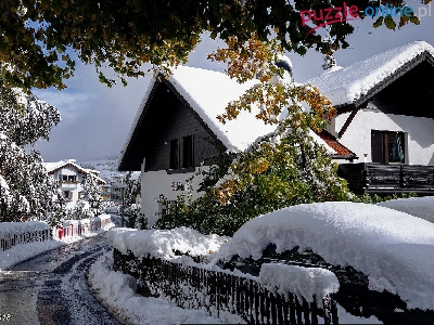 Puzzle Zima, Domy, Śnieg, Drzewa