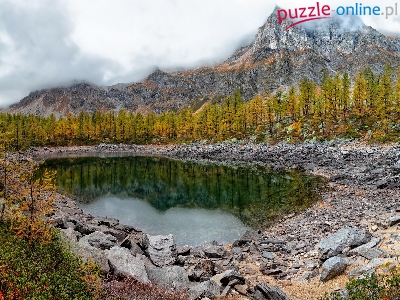 Drzewa, Góry, Jesień, Mgła, Kamienie, Lago Nero, Włochy, Żółte, Jezioro