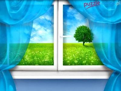 Drzewo, Zasłony, Okno, Łąka, Niebieskie