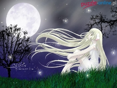 drzewo, księżyc, dziewczyna, Chobits, gwiazdy, trawa
