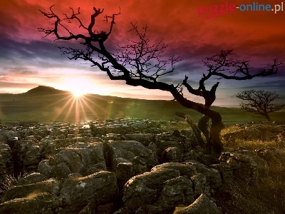 Puzzle Drzewo, Wschód Słońca, Kamienie, Niebo