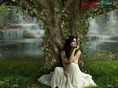 Puzzle Drzewo, Zamyślona, Kobieta, Wodospady