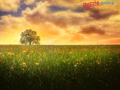 Puzzle Drzewo, Łąka, Kwiaty, Chmury
