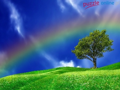 Puzzle Drzewo, Łąka, Kwiaty, Tęcza