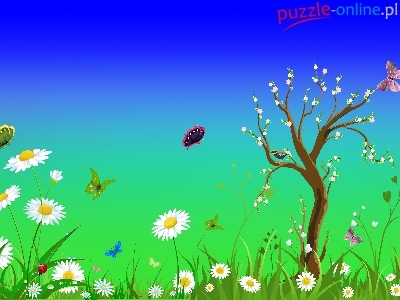 Puzzle Drzewo, Wiosna, Kwiaty, Motylki