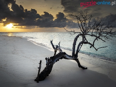 Chmury, Plaża, Morze, Drzewo, Słońce, Niebo
